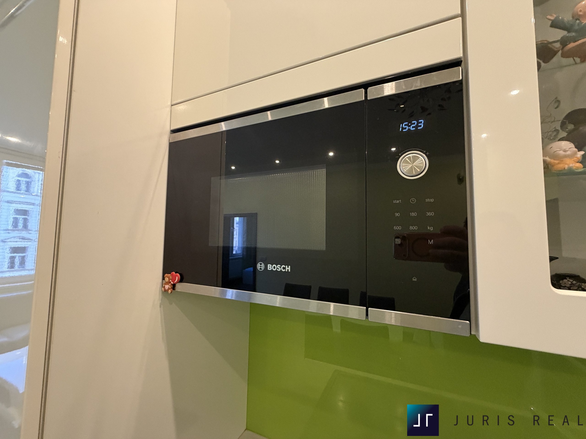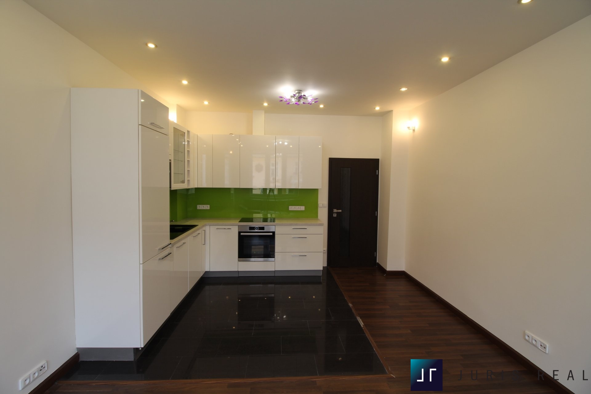 Dominantou bytu je světlý obývací prostor s moderní kuchyňskou linkou v bílém vysokém lesku, vybavenou vestavnými spotřebiči Bosch a designovým skleněným obkladem v zeleném tónu. Jednotná dřevěná podlaha v obytné části podtrhuje elegantní charakter interiéru, který působí vzdušně, čistě a nadčasově. Prostor nabízí dostatek místa pro velkou sedací soupravu i reprezentativní jídelní část.